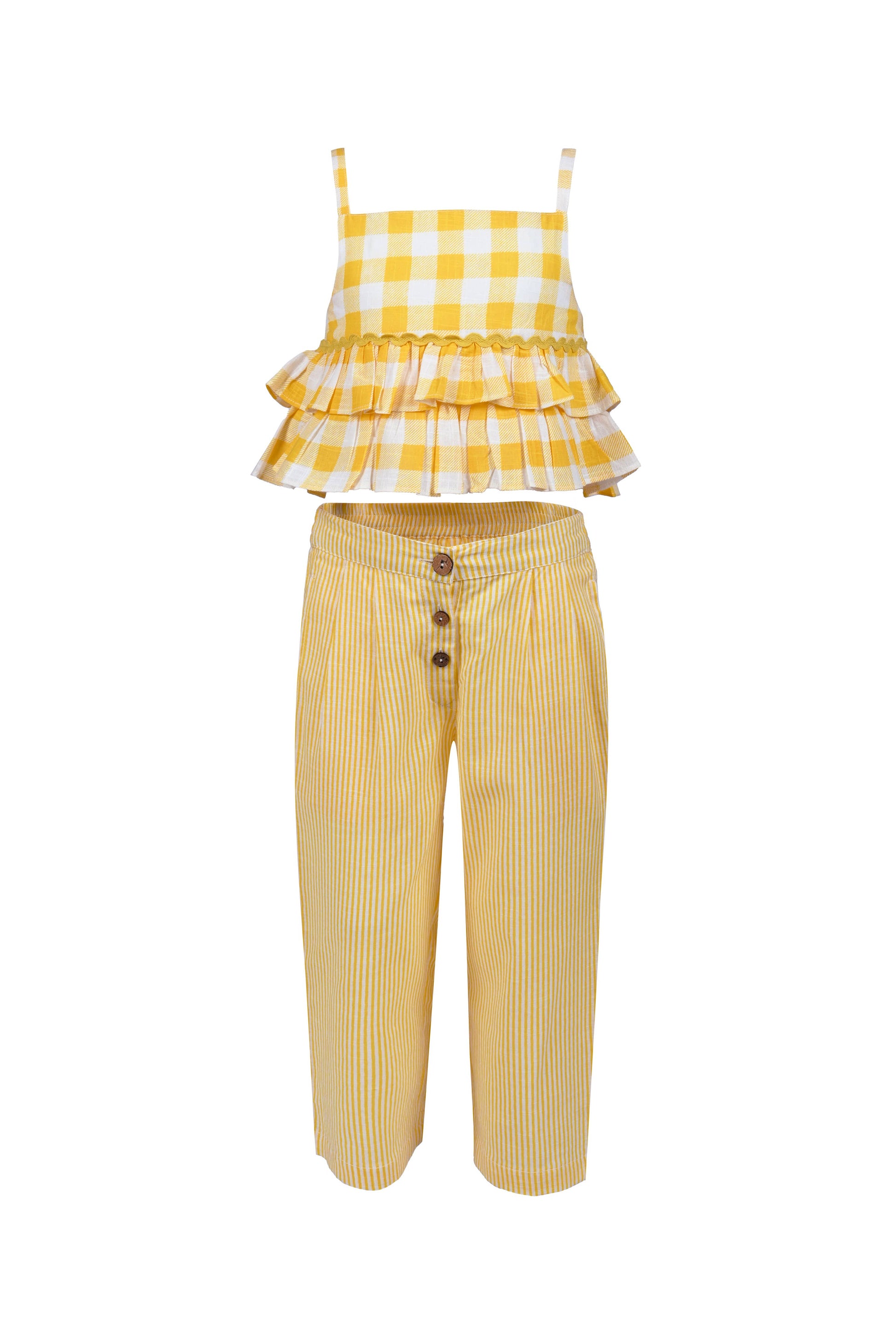 Dress your little one in this Sunny Gingham Set .The top features an adorable yellow checks pattern with adjustable shoulder straps and tiered gaidered design, while the matching striped pants add a playful touch. The infant size comes with a matching bloomer for a complete look. * Shell: 100% cotton * Lining: 100% cotton * Straps: Adjustable shoulder straps for a perfect fit * Elastic on pants * Button: Wooden buttons on the kids' pants for a classic touch * Infant Size: Comes with a matching bloomer for infants