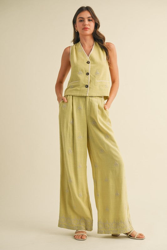 A refined two-piece (Bottom) for quiet mornings or warm days out. Made from a soft cotton-linen blend, this vest and wide-leg pant set is both tailored and relaxed. Embroidered accents and contrast binding add subtle detail. Wear together for a statement look or mix and match with everyday staples.