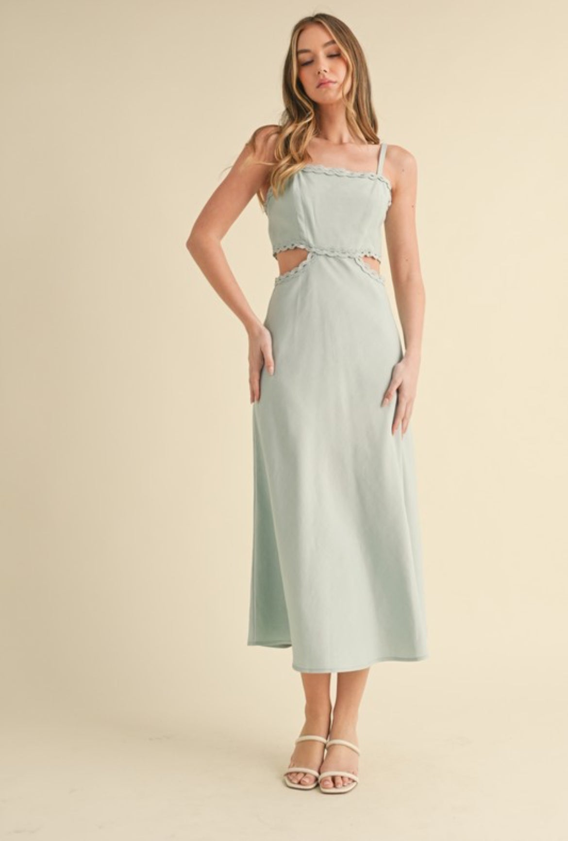 The Seafoam Kiss Midi Dress is the perfect blend of soft and romantic. With delicate lace trim and flattering side cutouts, this breezy style brings charm to any look. The midi length keeps it effortless and versatile for both daytime and evening plans.
